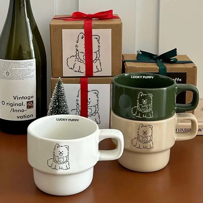 Original Stacking Puppy Cartoon Ceramic Coffee Mug Set, Cute Couple Mugs